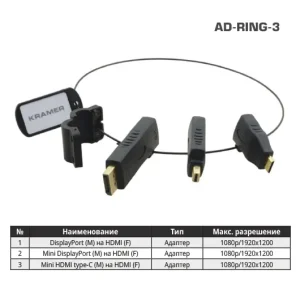 Комплект переходников Kramer AD-RING-3 на общем кольце с переходниками DisplayPort (вилка) на HDMI (розетка) 1080p, Mini DisplayPort (вилка) на HDMI (розетка) 1080p, Mini HDMI type-C (вилка) на HDMI (розетка) 1080p99-9191023Kramer21 782Под заказ