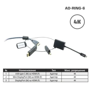Комплект переходников Kramer AD-RING-6 на общем кольце с переходниками Mini DisplayPort (вилка) на HDMI (розетка) 4K60 (4:2:0), DisplayPort (вилка) на HDMI (розетка) 4K60 (4:2:0), USB тип C (вилка) на HDMI (розетка) 4K60 (4:2:0)99-91910230Kramer28 706Под заказ