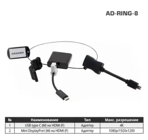 Комплект переходников Kramer AD-RING-8 на общем кольце с переходниками USB тип C (вилка) на HDMI (розетка) 4K60 (4:2:0), Mini DisplayPort (вилка) на HDMI (розетка) 1080p99-9191033Kramer21 613Под заказ