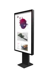 Особенности: защитное стекло. При помощи датчиков освещенности экран изменяет яркость от 500 до 2500 нит., Интерактивное устройство используется для навигации и в качестве рекламного носителя при любых погодных условиях. Прочный противовандальный корпус, система климат-контроля